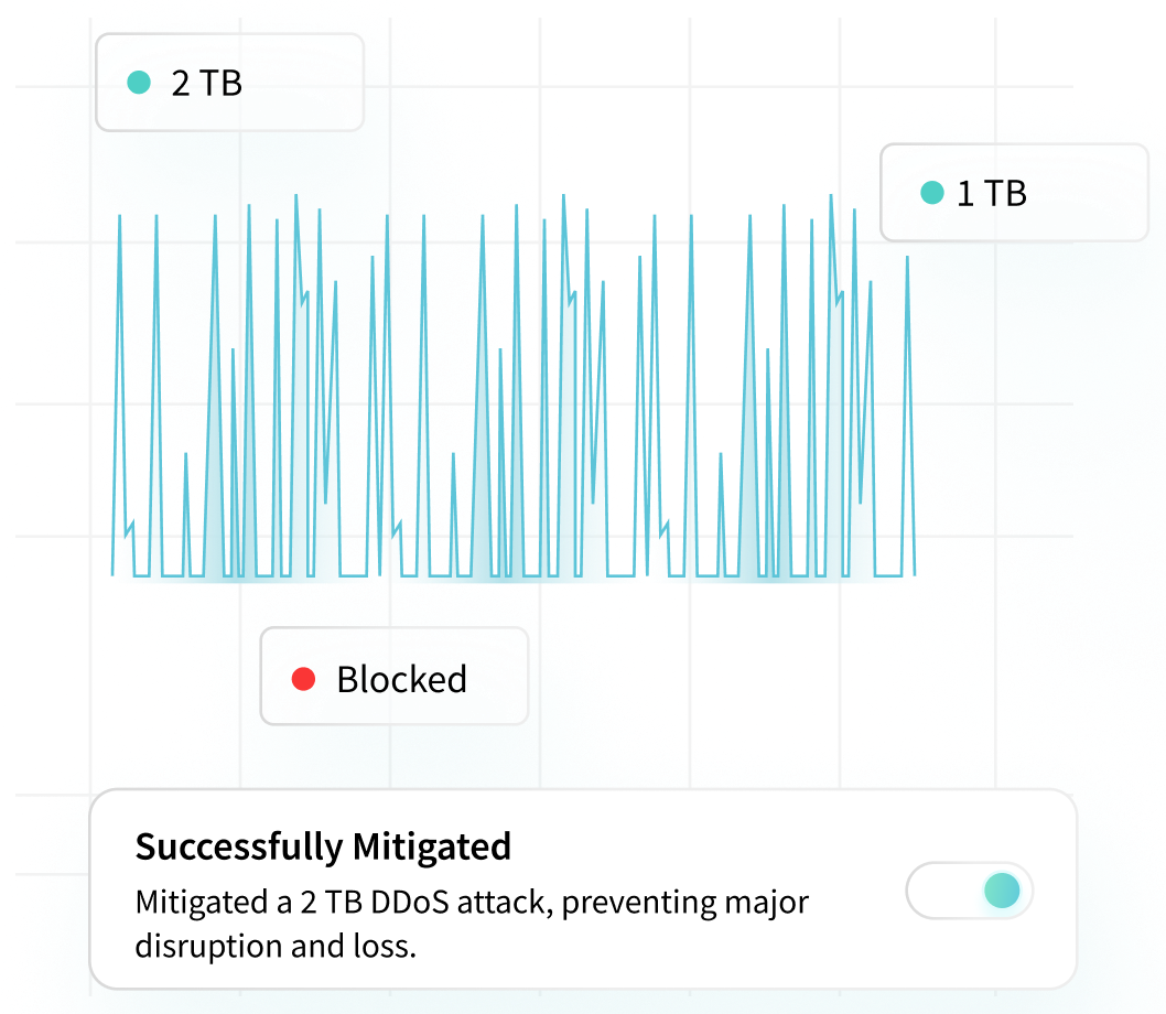 DDoS 防護 7x24 全天候監控並做到即時流量清洗,能有效抵擋各類惡意流量攻擊。無上限的 DDoS 緩解能力可應對 TB 級流量攻擊,特別適合金融業、政府網站和大型活動平台...等,確保企業在攻擊高峰期間仍能正常運作。